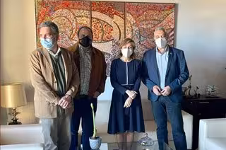 El presidente de la Diputación de Cáceres, Carlos Carlos, y el vicepresidente primero, Alfonso Beltrán, han mantenido un encuentro con la presidenta de la Asociación Española de Municipios del Olivo (AEMO), Ana María Romero, y su gerente para establecer las líneas de colaboración tras la adhesión de la institución provincial a dicha asociación, que fue aprobada en el pleno de ayer.