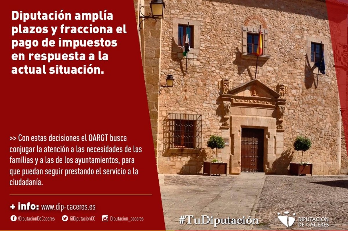 La Diputación de Cáceres, a través de su Organismo Autónomo de Recaudación y Gestión Tributaria (OARGT), ha decidido ampliar plazos y fraccionar el pago de impuestos con la finalidad de evitar mayores perjuicios a los ciudadanos y entidades locales, y con el objetivo de que se puedan conjugar las necesidades de las familias y de los ayuntamientos y se siga prestando el servicio a la ciudadanía.