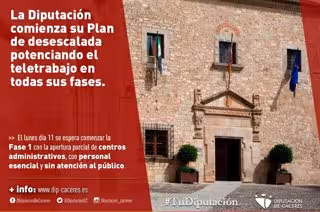 El fomento del teletrabajo, la alternancia presencial, las medidas de flexibilización horaria para la conciliación laboral y familiar y el carácter dinámico de acuerdo con la evolución de la situación, son los aspectos más destacados que se recogen en el plan para la transición hacia una "nueva normalidad" que ha elaborado la Diputación Provincial de Cáceres.