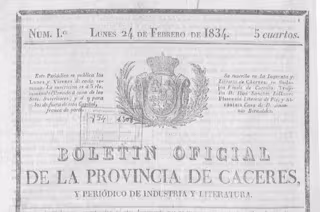 Fruto de esa normativa nace el Boletín Oficial de la Provincia (BOP)de Cáceres, cuyo primer ejemplar - o al menos el más antiguo conservado- data del 24 de febrero de 1834. Su periodicidad inicial fue de dos días por semana, publicándose los martes y viernes.