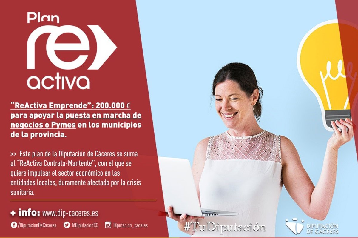 La Diputación de Cáceres ha puesto en marcha el plan 'ReActiva Emprende' a través del cual se destinan 200.000 euros para apoyar la puesta en marcha de negocios o pymes en los municipios de la provincia. El objetivo es ayudar al sector económico de los municipios y reactivar la economía de las zonas rurales, azotada por la situación sanitaria provocada por la Covid-19.