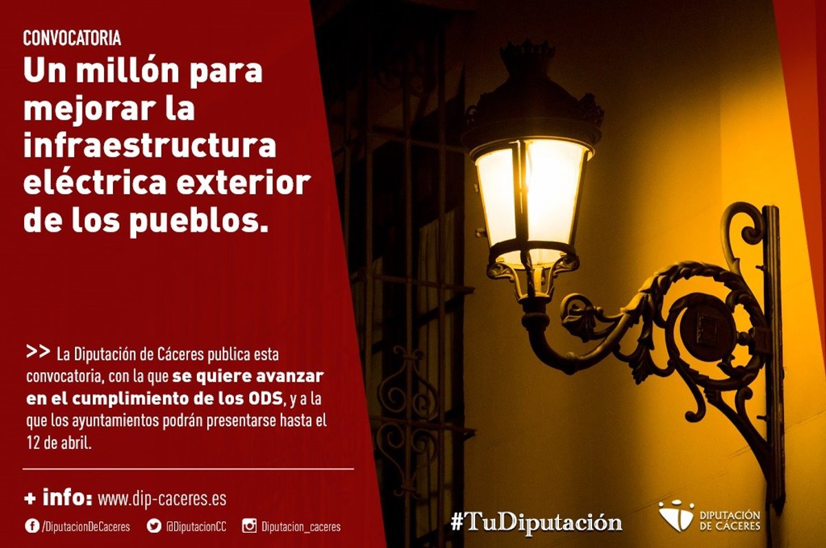 La Diputación de Cáceres ha publicado en el Boletín Oficial de la Provincia (BOP) la convocatoria de ayudas para la mejora de la infraestructura eléctrica exterior de municipios y entidades locales menores de la provincia, dotada con un millón de euros en total, y que pueden ser solicitadas hasta el 12 de abril.