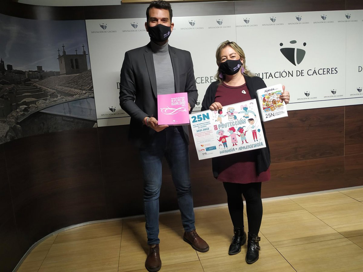El portavoz de la Diputación de Cáceres, Álvaro Sánchez Cotrina, y la concejala de Asuntos Sociales, Amelia Molero, presentan el material editado con motivo del 25N - EUROPA PRESS