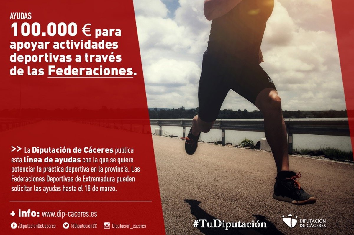 La Diputación de Cáceres ha publicado una línea de ayudas, dotadas con 100.000 euros de presupuesto total, para apoyar actividades deportivas a través de las federaciones con el objetivo de potenciar la práctica deportiva en la provincia. Cada solicitante podrá optar a un máximo de 8.000 euros para organizar trofeos, open, copas, campeonatos, etc.