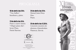 Así, la programación ha sido inaugurada por el Trío Zaffire de saxofones y piano el pasado viernes y continuará el viernes día 17 de abril con el piano a cuatro manos de Javier Plaza y Daniel Barroso.