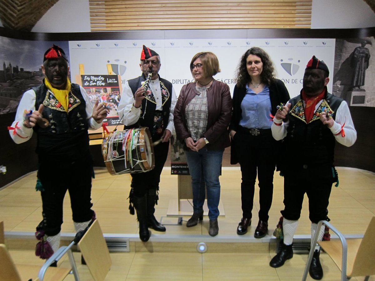 La festividad de 'Los Negritos' ha sido presentada este martes por la presidenta de la Diputación de Cáceres, Rosario Cordero, la alcaldesa de Montehermoso, María del Mar Mateos, y tres de los 'negritos' que participarán en los pasacalles y en las actividades programadas para los días 2 y 3 de febrero.