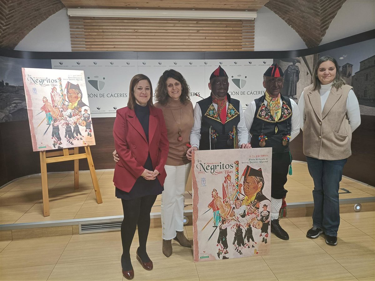 Los detalles de los festejos se han presentado este lunes en una rueda de prensa con la presencia de la diputada delegada de Turismo de la Diputación de Cáceres, Patricia Valle; la alcaldesa de Montehermoso, Mar Mateos; la concejala de Turismo, Violeta Martín, y dos de los negritos protagonistas, David Lorenzo Aparicio y Jaime Garrido.