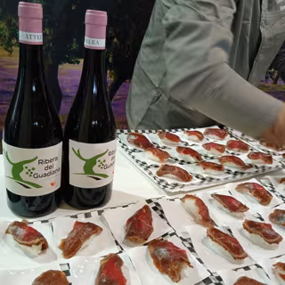 La primera actividad ha sido la degustación de Jamón Dehesa de Extremadura y Vino Ribera del Guadiana, seguido de catas maridaje de Quesos DOP y Vino DOP, y tendrá su momento culmen con la creación en vivo de tapas variadas.
