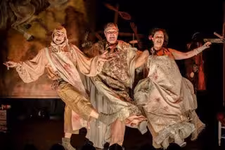 En escena, los actores Agustín Iglesias, Magda García-Arenal y Raúl Rodríguez, bajo la dirección de Agustín Iglesias, representarán esta obra que cuenta las andanzas de tres pícaros que se encuentran en la plaza de una villa cualquiera del Camino de Santiago.