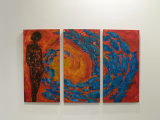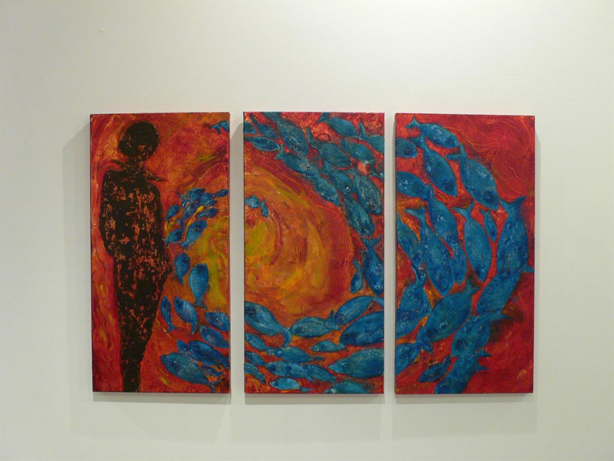 En la exposición, Marina Pintos fusiona diferentes técnicas y muestra un compendio de obras que "a pesar de la singularidad de cada una de ellas, constituyen un corpus de cierta homogeneidad, girando en torno a una misma idea que se expresa mediante la poética del color y la forma".