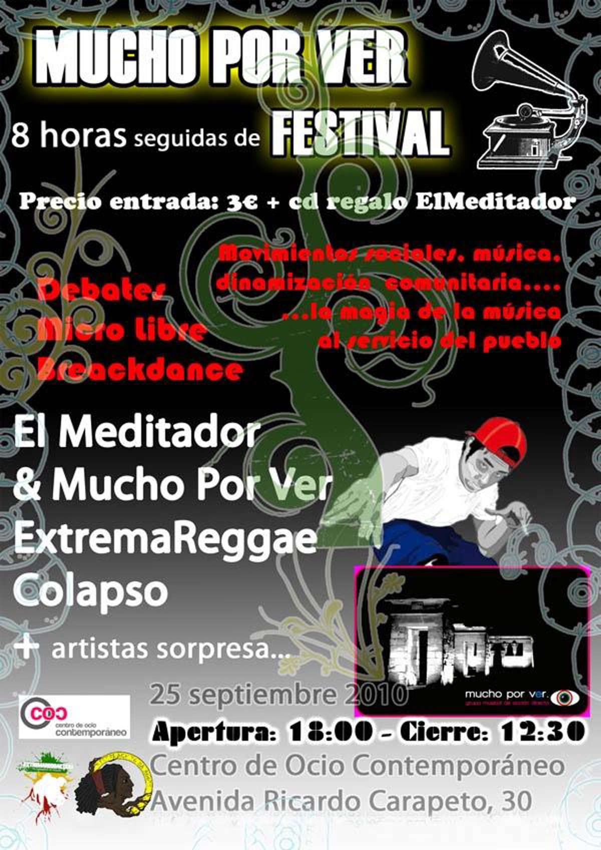 Tras la exposición y debate comenzará el micro libre en el que un gran número de emsis y singjeys mostrarán sus rimas y sus cantos a ritmo de rap y reggae. Mientras esto sucede el breakdance tendrá también su momento.