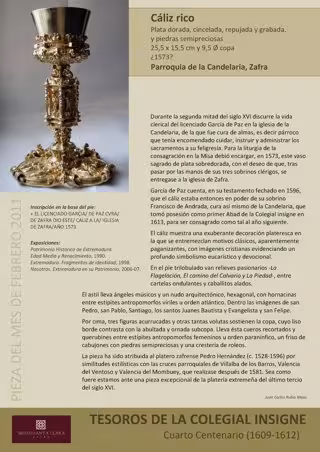 El Museo Santa Clara de Zafra (Badajoz) ha elegido como pieza del mes de febrero una "muestra excepcional de la platería extremeña" del siglo XVI, como es el llamado Cáliz rico de la Colegiata zafrense, que se encuentra expuesta en la Galería alta.