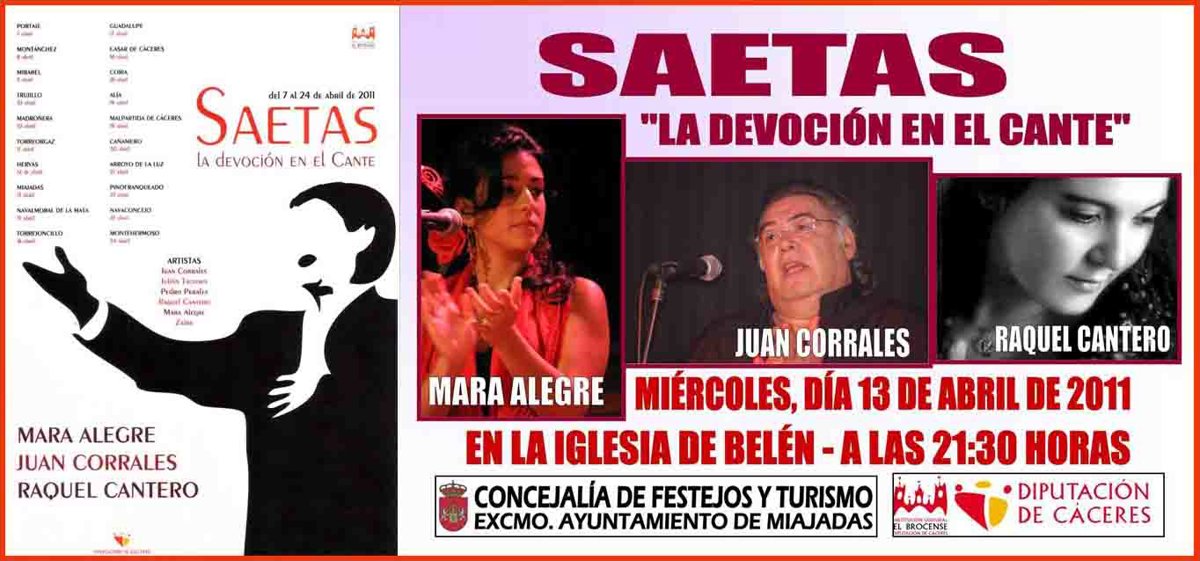 Este programa de saetas llegará a la localidad de Miajadas el miércoles 13 de abril, día en que arranca la programación de Semana Santa en este municipio. El espectáculo tendrá lugar en la Iglesia de Belén a las 21,30 horas.