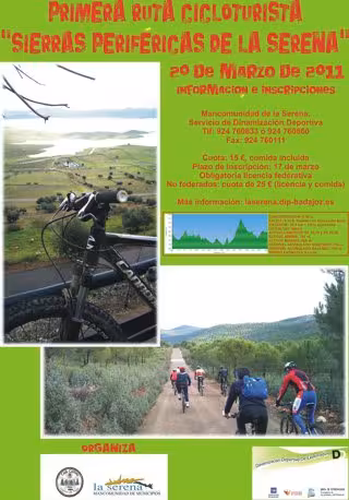Esta primera ruta cicloturista 'Sierras periféricas de La Serena' está organizada por el Área de Dinamización Deportiva de la Mancomunidad de Municipios La Serena y el Club Ciclista 'Dientes de Perro' de Castuera con la colaboración de la productora Medios de Difusión La Serena, que además se encargará de grabar toda la prueba.