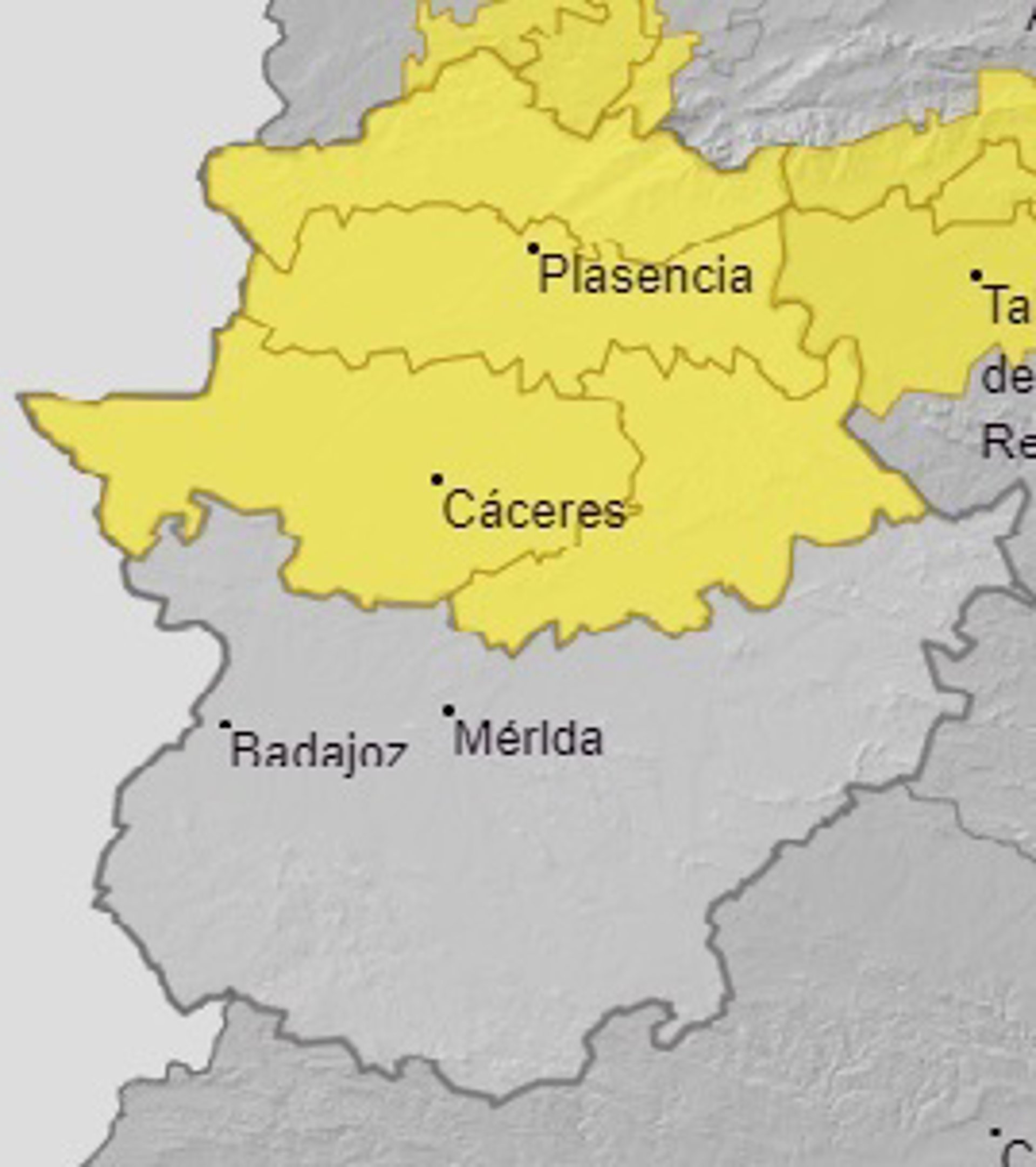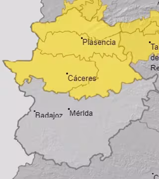 Así, según datos de la Agencia Estatal de Meteorología (AEMET), la provincia cacereña permanecerá en este nivel desde las 12,00 hasta las 22,00 horas, ya que podría producirse una precipitación acumulada de 15 litros por metro cuadrado en una hora.