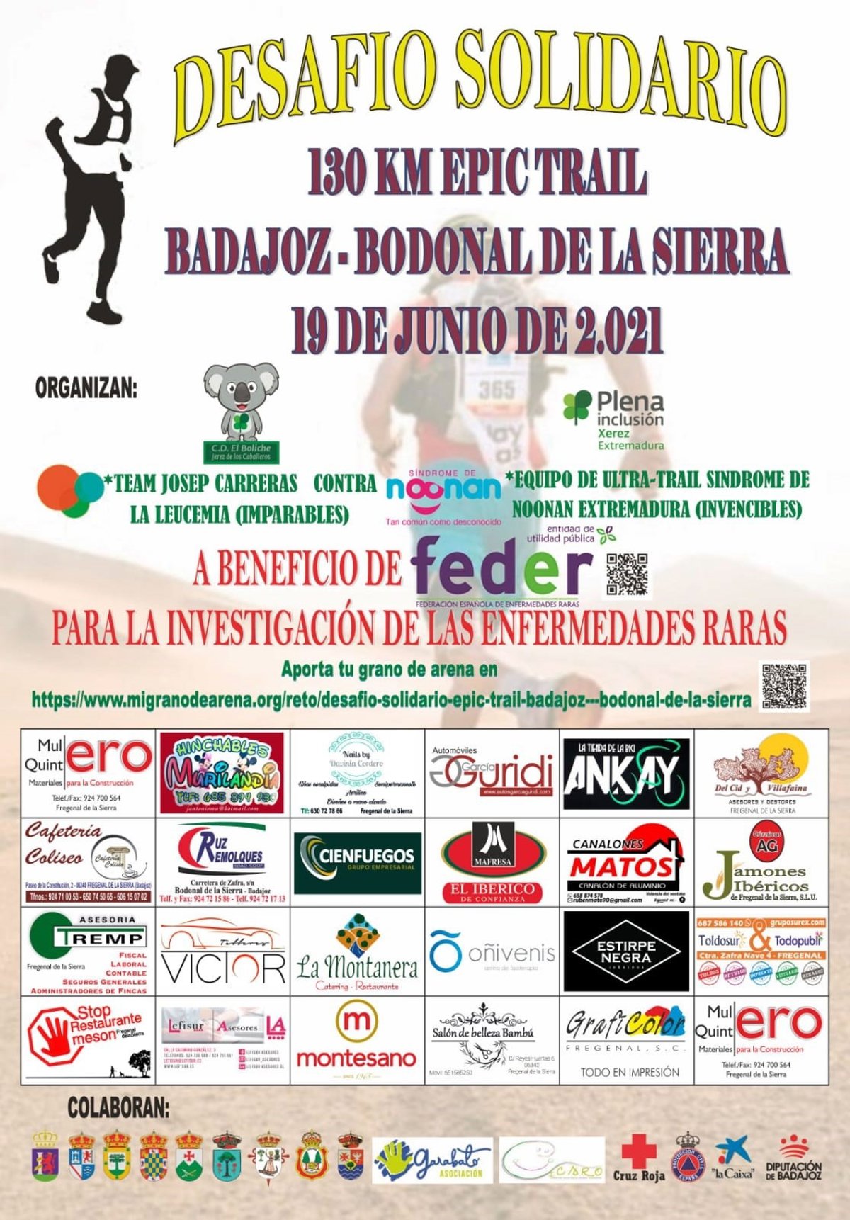 Al respecto, supone un desnivel positivo de 1.500 metros, con salida desde la puerta principal del Hospital Materno Infantil de Badajoz y llegada a la Plaza de España de Bodonal de la Sierra. Los participantes son Josan, Rafa, Ángel, Francisco José, Rubén, Julio, Javier, Luis, Iván, Juanma, Cristofer, Juanma, Jordi, Leandro, Josan, Carlos, Manuel, Ismael y Paco. Se puede encontrar más información a través de la página de Facebook Desafío Solidario-Feder-Epic Trai.