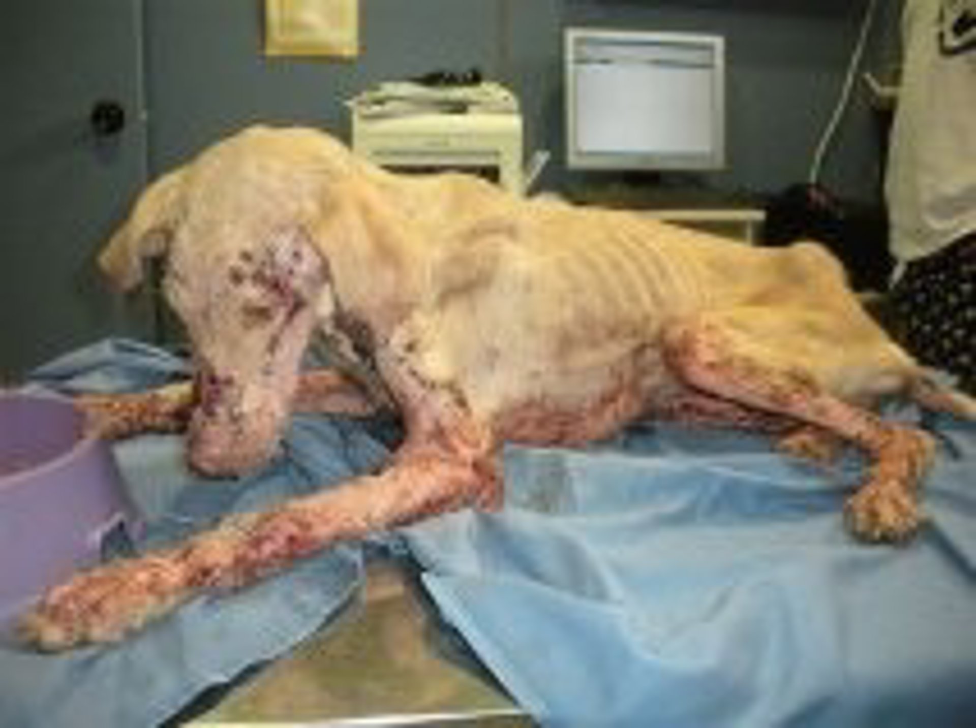 Fue la Guardia Civil la que localizó a un miembro de Adana para informarle de la aparición de esta perra, que fue trasladada a Badajoz y "desde el sábado está hospitalizada, luchando por su vida", ya que "presenta un cuadro de quemaduras por algún tóxico en abdomen, extremidades y cara" y "los próximos días serán claves" para su supervivencia, explica Adana.