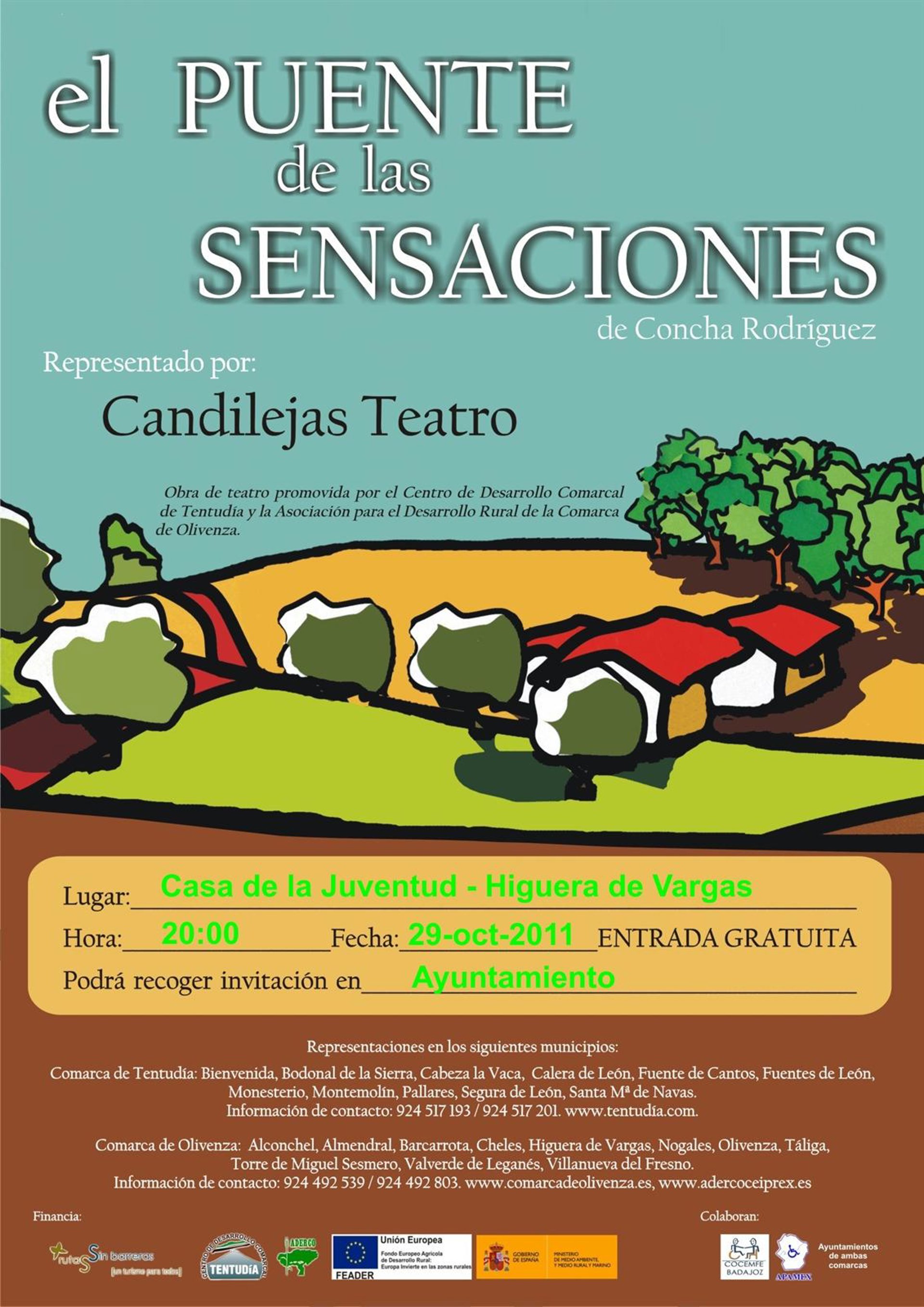 Las representaciones de 'El puente de las sensaciones' comenzaron en Bienvenida el pasado 8 de octubre, y este fin de semana se inicia la gira por la comarca de Olivenza, siendo el lugar elegido para el pistoletazo de salida la Casa de la Juventud de Higuera de Vargas, este sábado, día 29 a las 20,00 la tarde, y el domingo en el pabellón deportivo de Barcarrota a la misma hora.