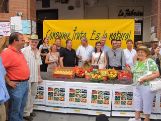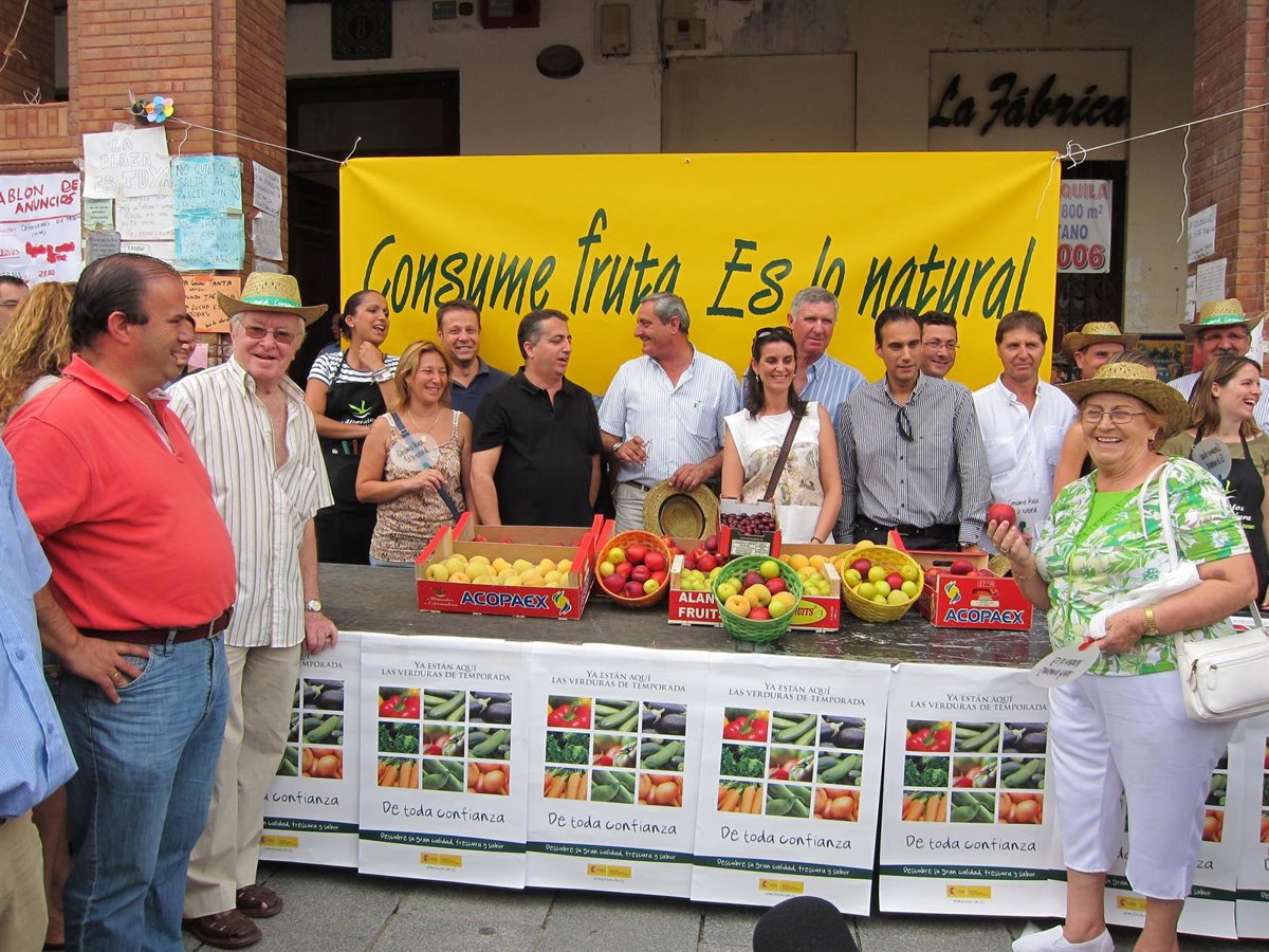 En defensa del sector se han unido este viernes, bajo el lema 'Consume fruta, es lo natural', las organizaciones agrarias APAG Extremadura Asaja, COAG, UPA-UCE, APAG Asaja Cáceres y Afruex, junto con los sindicatos CCOO y UGT, para realizar este acto de protesta, en el que los ciudadanos que pasaban por la Plaza de España de la capital extremeña han hecho largas colas para obtener un vaso de gazpacho o piezas de fruta.