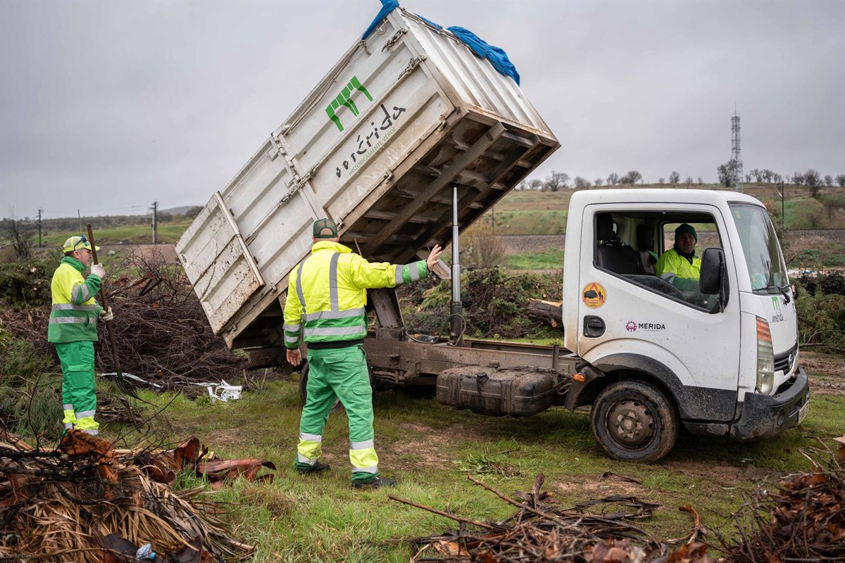 Operarios del Ayuntamiento de Mérida durante las labores de limpieza de los desperfectos provocados por la borrasca Kristin. - AYUNTAMIENTO DE MÉRIDA