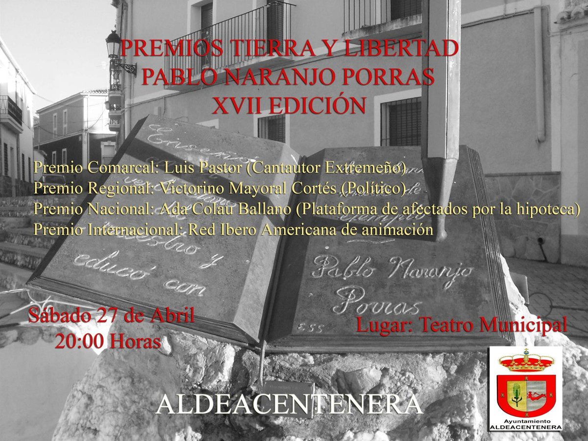 El Teatro Municipal de Aldeacentenera (Cáceres) acoge este sábado, día 27, a las 20,00 horas, la entrega de los XVII Premios Tierra y Libertad 'Pablo Naranjo Porras'.