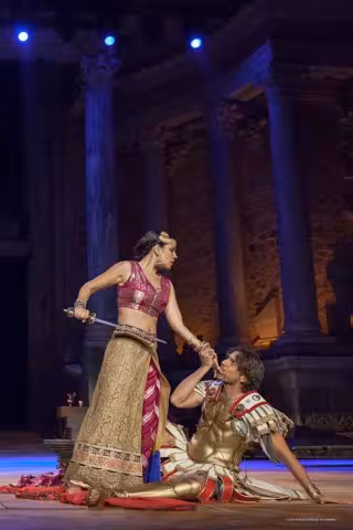 La trama se desarrolla en un escenario del Teatro Romano de Mérida que ha sido caracterizado para la ocasión por la escenógrafa Mónica Borromello, como una gran piscina dividida por una gran tarima central, que simboliza los ríos Hidaspes e Indo.