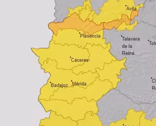 Asimismo, el riesgo será de nivel naranja en el norte de Cáceres, donde pueden acumularse hasta 80 litros en 12 horas.