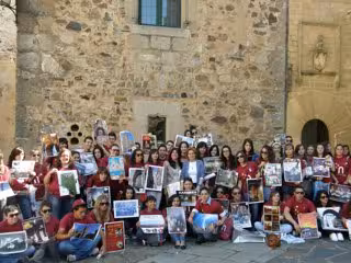 Los estudiantes portaban algunos de los trabajos realizados en papel, en los que han estado trabajando durante dos meses, y se los enseñaron a la presidenta del Consorcio Cáceres 2016 y alcaldesa de Cáceres, Carmen Heras, a la que recibieron con aplausos, y que se mostró muy agradecida por la iniciativa.
