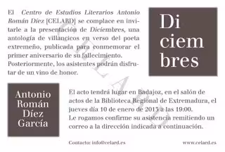 Con dicho acto inaugura su actividad en Badajoz el Centro de Estudios Literarios Antonio Román Díez (Celard), coincidiendo con el primer aniversario del fallecimiento del poeta.