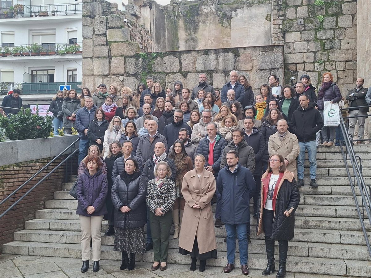 Minuto de silencio --con participación de la presidenta en funciones, María Guardiola-- a las puertas de Presidencia de la Junta de Extremadura, en Mérida, en recuerdo de la última mujer asesinada por violencia machista en la región - EUROPA PRESS