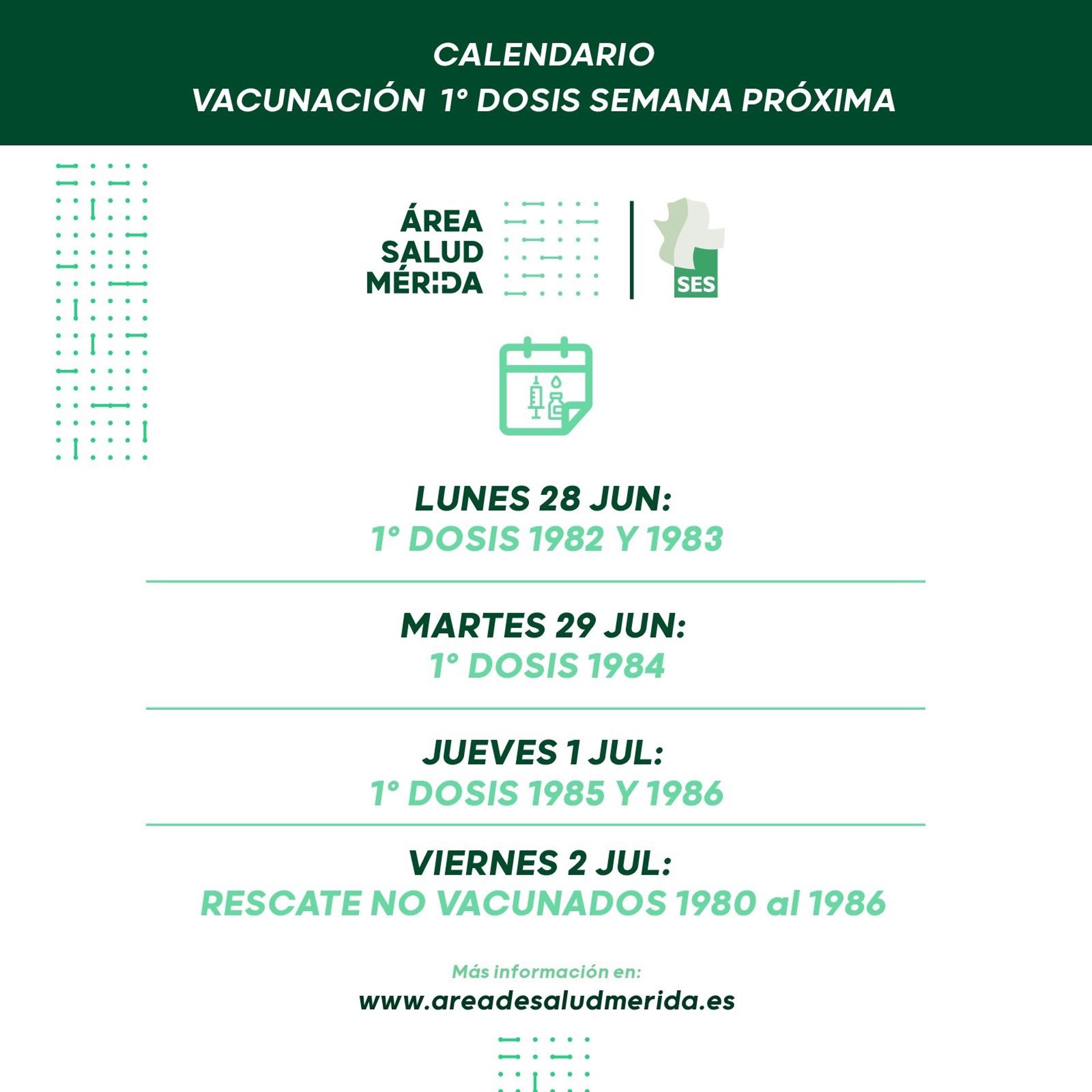 De igual modo, para el viernes 2 de julio el Área de Salud de Mérida anuncia un rescate de vacunación destinado a personas no vacunadas y nacidas de 1980 a 1986.