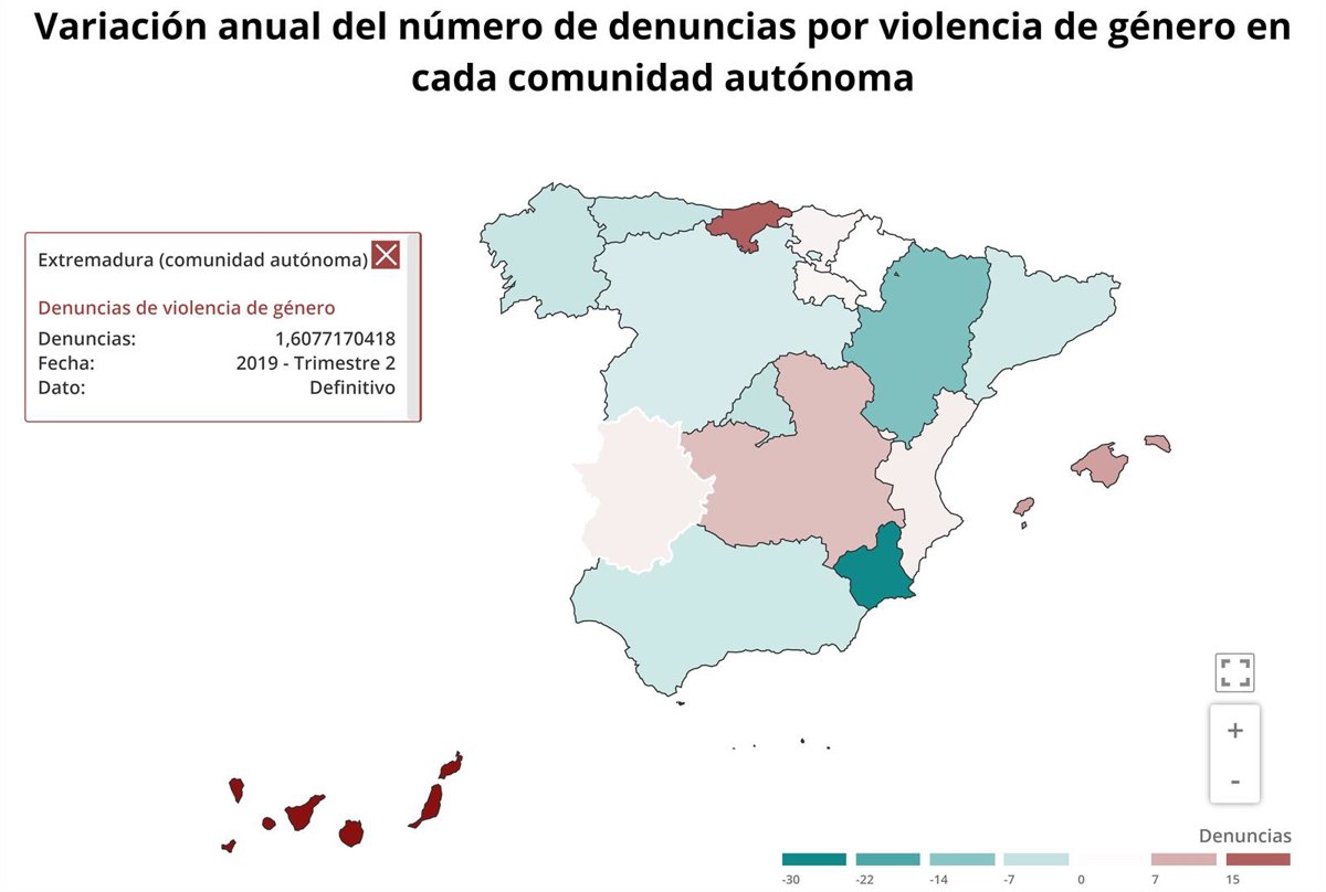 En cuanto a la ratio de mujeres víctimas de violencia de género por cada 10.000 mujeres, destacan por encima de la media nacional (16,2), las comunidades de Canarias, con una ratio de 22,6, Baleares (21,9) y la Comunidad Valenciana (21,5), mientras que la ratio más baja se dio en Aragón, con 9,8, Castilla y León, con 10,1, Galicia, con 11 y Extremadura, con 11,7.