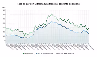 De este modo, la tasa de paro de Extremadura se situó en el 18,94%, más de cinco puntos por encima de la media nacional (13,33%) y la segunda más alta de todas las comunidades autónomas, por detrás de Andalucía (20,18%) e igualada con Canarias, y con una tasa más baja que las dos ciudades autónomas, Ceuta y Melilla, que se sitúan en el 26,86% y el 20,24%, respectivamente.