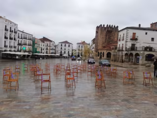 Sillas vacías en la Plaza Mayor de Cáceres en recuerdo de las mujeres asesinadas por violencia de género este año - EUROPA PRESS