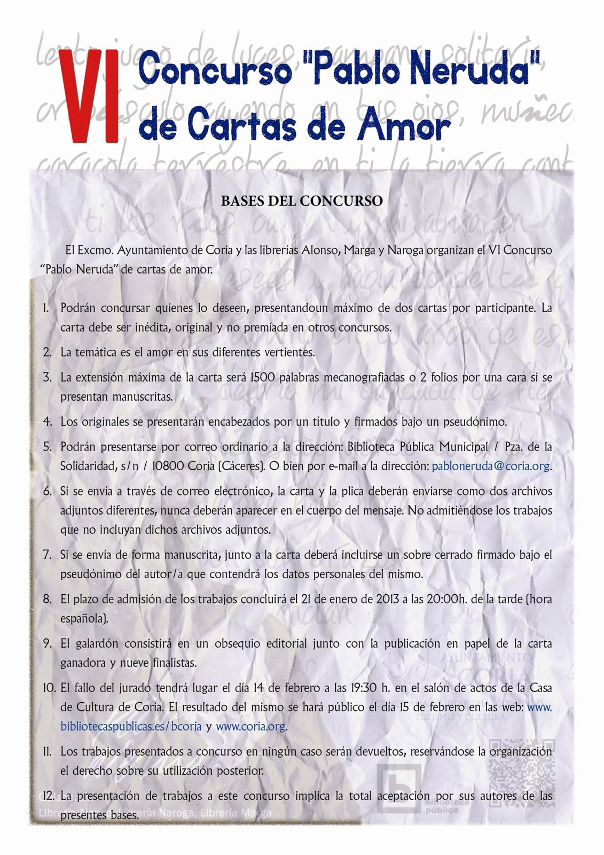 El Ayuntamiento de Coria (Cáceres) y las librerías Alonso, Marga y Naroga organizan el VI Concurso 'Pablo Neruda' de Cartas de Amor, cuyo plazo de admisión de trabajos concluirá el próximo 21 de enero a las 20,00 horas.