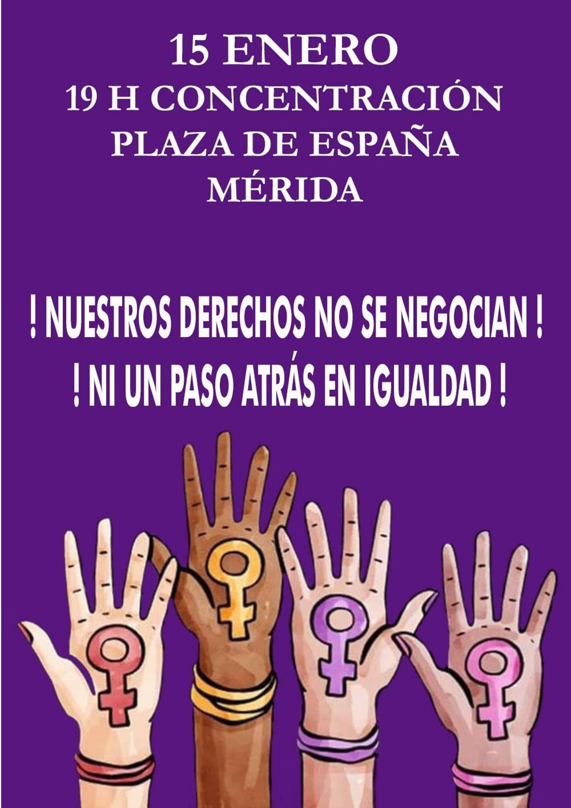 Las ciudades de Mérida, Badajoz y Cáceres se sumarán este martes, 15 de enero, a las concentraciones convocadas por colectivos feministas en todo el país bajo el lema 'Ni un paso atrás en igualdad. No Negociamos' en solidaridad con las mujeres de Andalucía y contra los postulados de VOX.