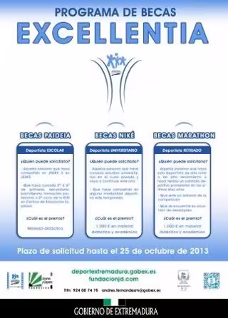 Según informa el Gobierno extremeño en una nota de prensa, el programa de becas 'Excellentia' está dividido en tres bloques: las Becas Paideia, destinadas a deportistas en edad escolar que compaginen su formación con la carrera deportiva, y en cuya convocatoria se incluye a deportistas con diversidad funcional en etapa formativa que pertenezcan tanto a centros ordinarios como a centros de educación especial. Contarán con una ayuda en material didáctico.