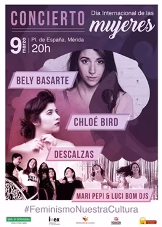 Las cantantes Bely Basarte y Chloé Bird, el grupo Descalzas y las dj's 'Mari Pepi & Luci Bom & otras chicas del montón' actúan este sábado, 9 de marzo en Mérida, en el concierto que se celebra bajo el lema 'El feminismo, nuestra cultura'.