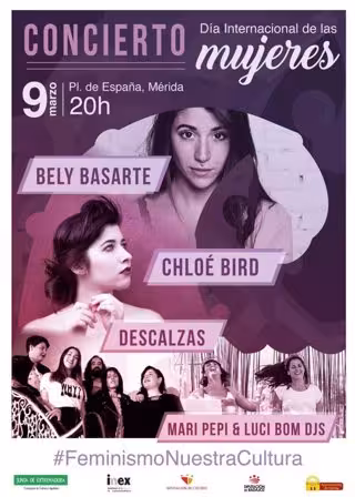 Las cantantes Bely Basarte, Chloé Bird, Descalzas y las dj's 'Mari Pepi & Luci Bom & otras chicas del montón' componen el cartel del concierto que tendrá lugar el sábado, 9 de marzo, en Mérida, con motivo del Día Internacional de las Mujeres.