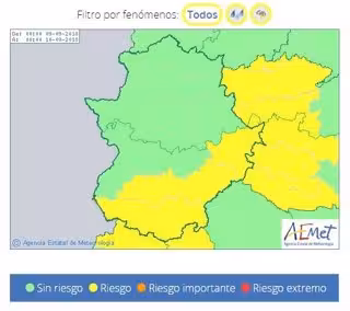 De esta forma, las zonas de Barros y Serena, La Siberia extremeña, Sur estarán en alerta entre las 14,00 y las 20,00 horas por fuertes lluvias, que pueden superar los 15 litros por metro cuadrado acumulados en menos de una hora, y que asimismo podrán ir acompañadas de tormentas.