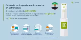 Cada extremeño depositó en el Punto SIGRE de la farmacia 85 gramos de envases vacíos o con restos de medicamentos en 2021, una cifra que supone un incremento del 9 por ciento respecto al ejercicio anterior, según se desprende del informe anual de actividad presentado por SIGRE a las autoridades medioambientales de la Junta de Extremadura.