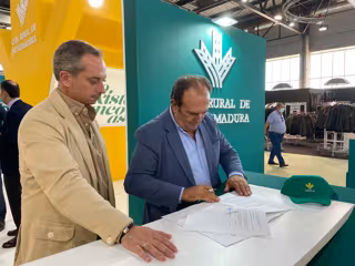 La firma ha tenido lugar en el stand de Caja Rural de Extremadura en la Feria de la Caza, Pesca y Naturaleza Ibérica (FECIEX), que cumple su 30 aniversario, después de que el año pasado no se pudiera realizar en este evento por culpa de la pandemia.