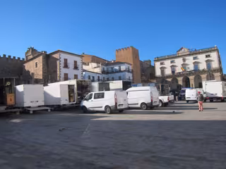 La Plaza Mayor de Cáceres que habitualmente presenta una estampa libre de coches, ha cambiado su imagen por otra repleta de camiones que transportan el material de las obras de televisión que se están rodando en la parte antigua de la ciudad, y a los que se les ha autorizado el aparcamiento en la plaza para facilitar la descarga de todo lo necesario para las grabaciones.