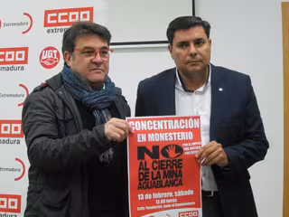 Los secretarios generales de CCOO y UGT de Extremadura, Julián Carretero y Francisco Capilla, respectivamente, han animado a la sociedad extremeña a participar en la concentración que se celebrará este sábado, día 13, a las 12,00 horas, en la localidad pacense de Monesterio contra el cierre de la mina Aguablanca.