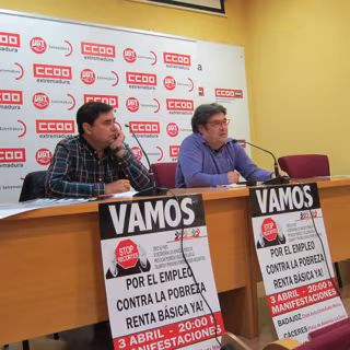 Así lo han indicado en una rueda de prensa en Mérida los secretarios generales de CCOO y UGT en Extremadura, Julián Carretero y Francisco Capilla, respectivamente, quienes han coincidido en reclamar un "cambio" en las políticas que está llevando a cabo el Gobierno regional.