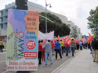 Más de 2.000 personas, según los sindicatos CCOO y UGT Extremadura --500 según la Delegación del Gobierno en la región-- se han manifestado este domingo, 1 de mayo, en Mérida (Badajoz), con motivo del Día Internacional del Trabajo, bajo las consignas de 'Empleo con derechos' y 'Contra los recortes sociales'.