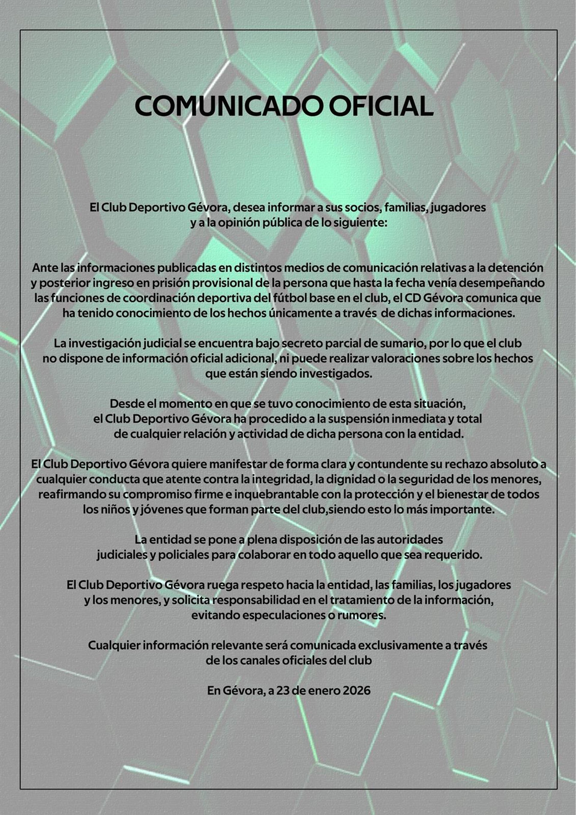 "Desde el momento en que se tuvo conocimiento de esta situación, el CD Gévora ha procedido a la suspensión inmediata y total de cualquier relación y actividad de dicha persona con la entidad", ha asegurado el club pacense en un comunicado oficial publicado en redes sociales, recogido por Europa Press.