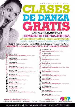 El Centro Artístico de Badajoz (CAB) ofrecerá clases de danza gratuitas de diversas disciplinas durante las jornadas de puertas abiertas que celebrará los días 3 y 4 de enero.