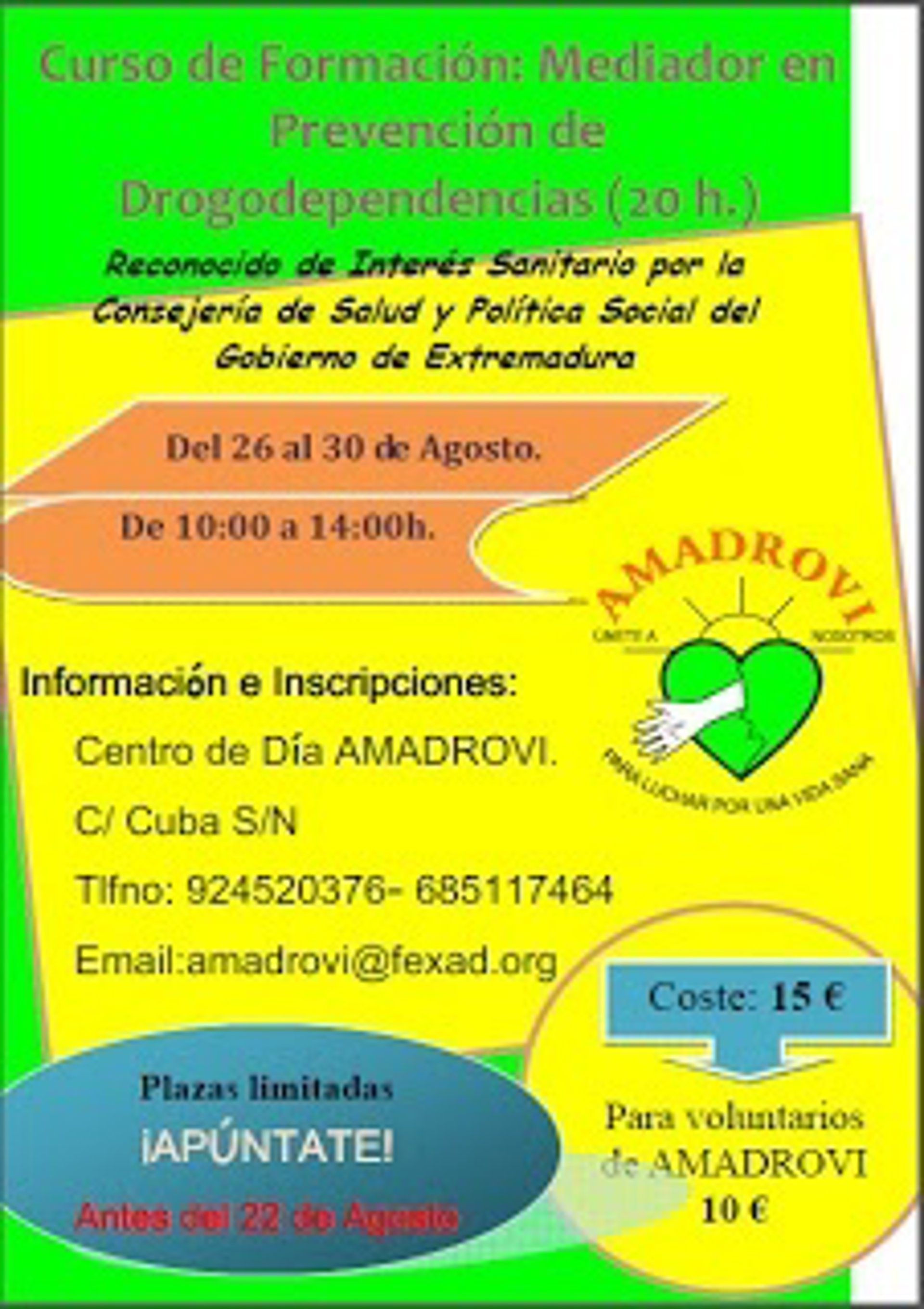 El centro de día 'Amadrovi' impartirá un curso de 'Mediador en Prevención de Drogodependencias' en Villafranca de los Barros (Badajoz) con una duración de 20 horas, repartidas en la semana del 26 al 30 de agosto.