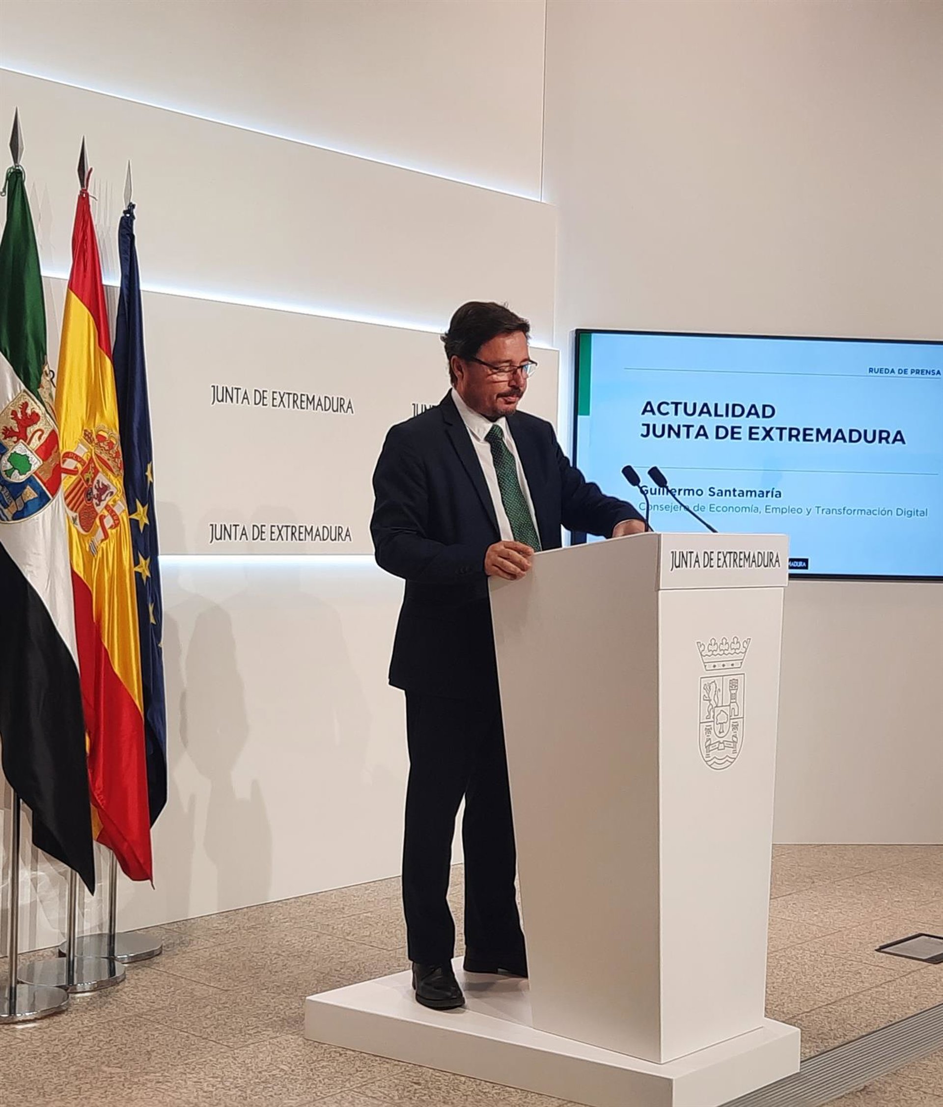 El consejero de Economía, Empleo y Transformación Digital, Guillermo Santamaría, en rueda de prensa para informar sobre el estado del proyecto del centro logístico de Amazon en Badajoz - EUROPA PRESS